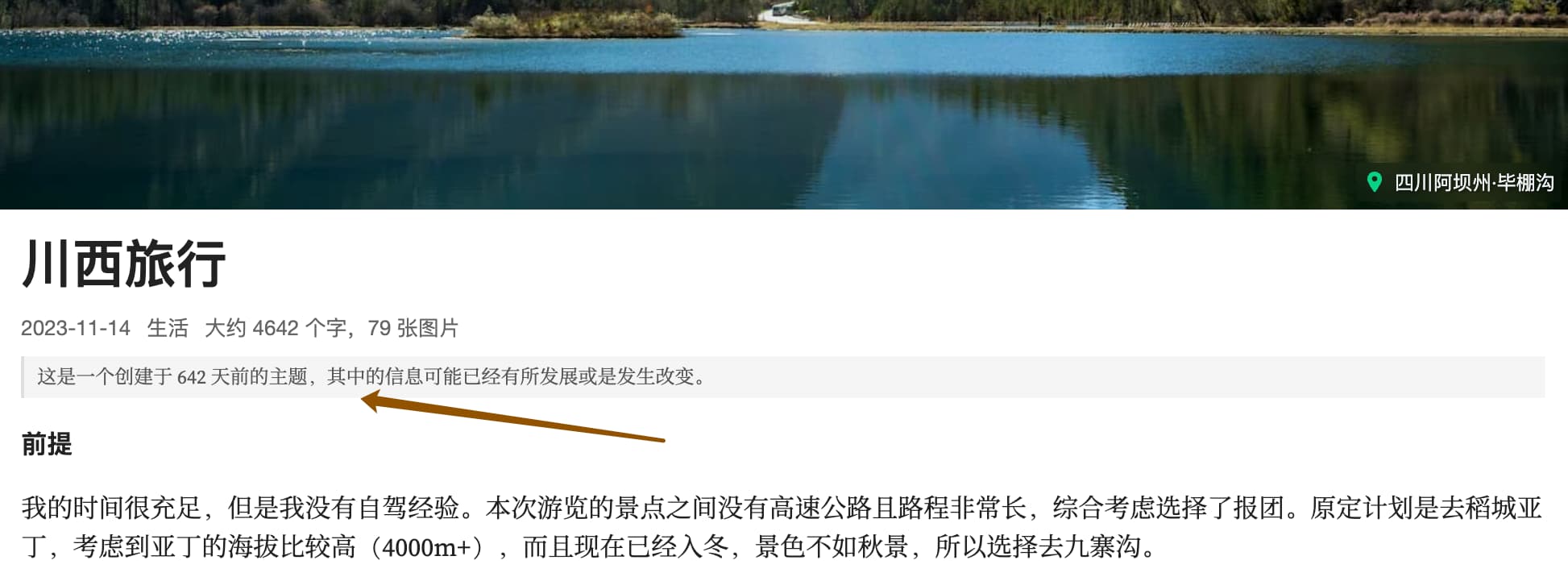 目前在旅行系列下的文章都添加了 ageWarning,在当前时间 - 文章发布时间 > 180 天时展示。